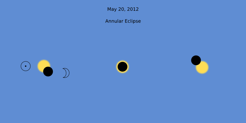 Next up is an eclipse. For us here on Earth, the only example is between the Moon and the Sun. That is because they are the same apparent size or nearly so. As I mentioned in the video, the Moon is slightly smaller this time around and thus we have an Annular Eclipse (meaning ring) rather than a Total Eclipse.