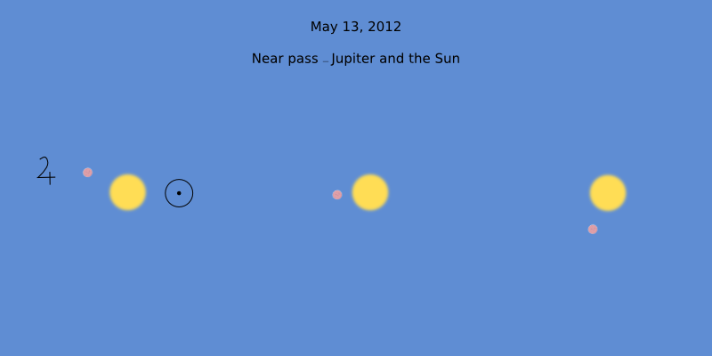 This first picture shows the Jupiter–Sun conjunction due this weekend. For us in CDT, it will occur Sunday morning. As you can see, Jupiter will pass near the sun, but not exactly. This is the most common type of conjunction.