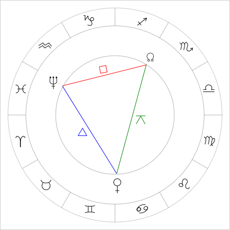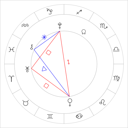What you see here (the blue part) is Venus Trine Neptune. When Venus and Neptune trysts, it is not good news for the rest of us. Well, it feels great for a minute or two, but it’s not likely to work out. Under a configuration like this, you can meet the man or woman of your dreams to find out that you were, in fact, only dreaming. Too good to be true is just that – untrue.