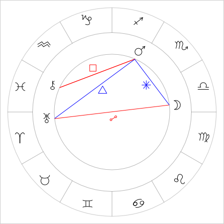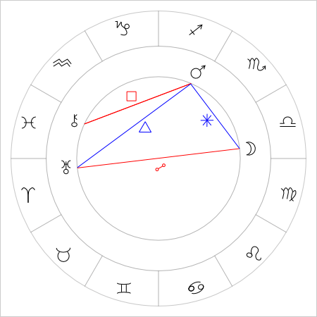 Before moving on, consider some of the glyphs involved in the above chart. Mars and Sagittarius both feature arrows pointing up and to the right; Uranus and Aries both have horns; and the moon and Libra are both comprised of crescents. Looking at it one way, all of these are weapons that pierce: the arrow, horns, and a sickle.