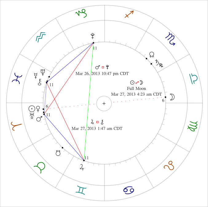 This year, the Libra moon is not only opposite the Aries sun, it also opposes Venus (conjunct the sun within orb – exact on 3/28/2013 at 12:04 pm CDT). Full Moons always tug on the emotions, but this one ought to be especially romantic – assuming the other aspects don’t distract you.