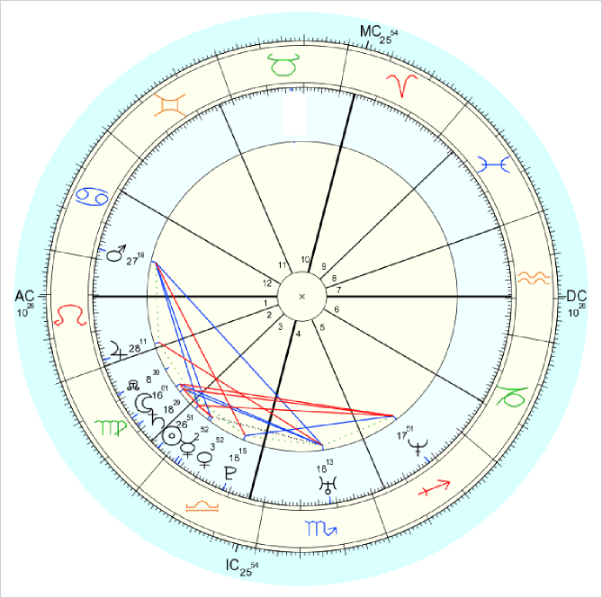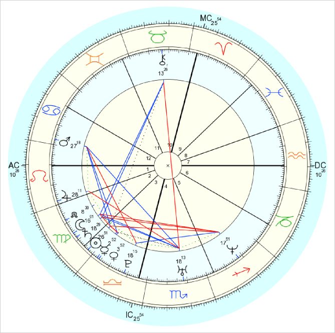 More things to consider: notice that Mars is primarily connected with blue lines on the left, and Neptune with red lines on the right. If we were to associate colors with these two planets, they would certainly be the opposite. Mars is clearly the red planet and Neptune the blue! Mars is quintessentially masculine and Neptune quite feminine – yet Mars is on the left – the feminine side and Neptune the right – the masculine side. Furthermore, Mars, which rules a fire sign, is in a water sign and Neptune, which rules a water sign, is in a fire sign. All of this implies additional balance and with a smooth texture – a meeting in the middle rather than the weighing of extremes. I am now seeing a man who is easy to like – no matter who you are.