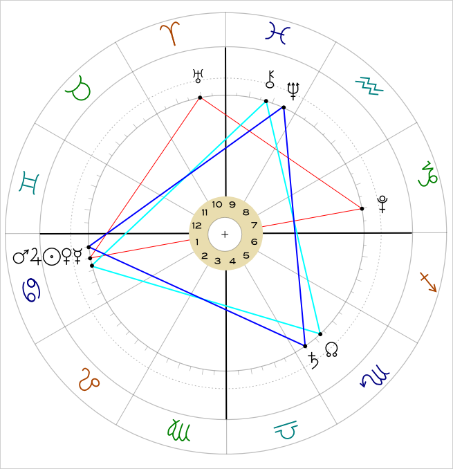 The dark blue triangle takes center stage. It is a Grand Trine in Water. Each point is 120 degrees from the other two. This is the most harmonious aspect in Astrology. It is elemental, which is to say that the corners occupy the three signs that share the same element. This configuration is known as a flowing aspect, and never more than when in water.