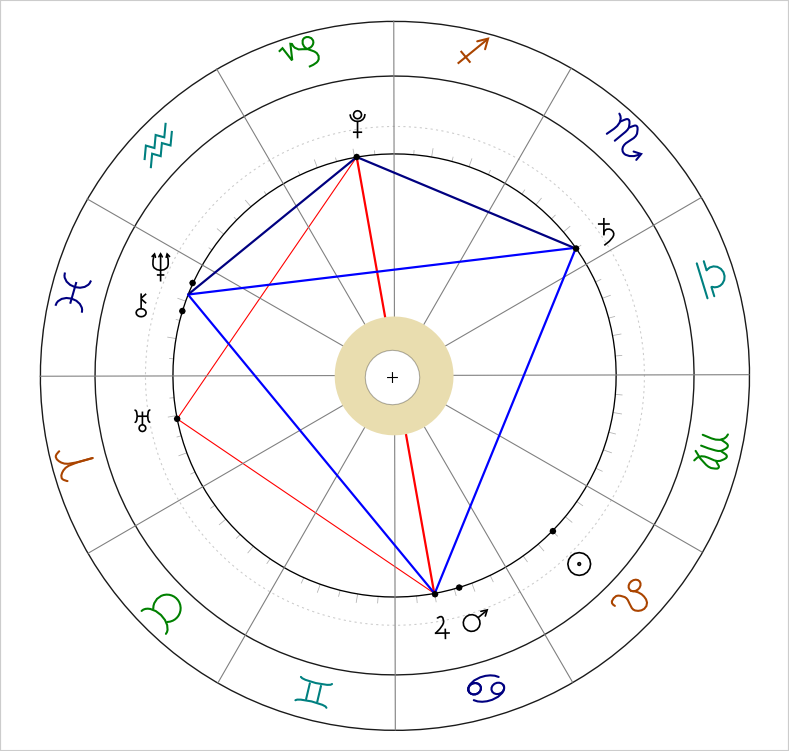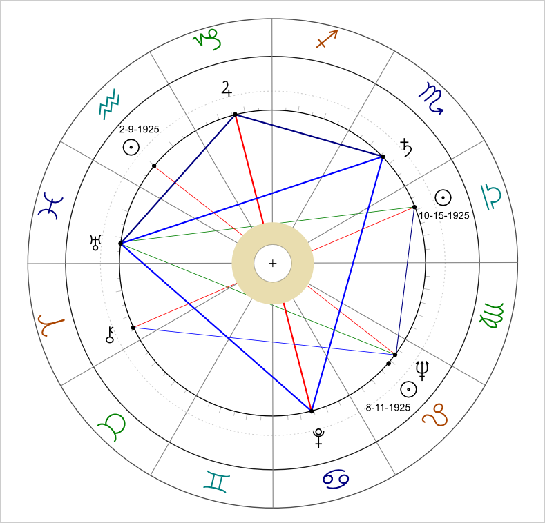 Incidentally, Richard Burton was born in November 1925 and has the above kite in his chart. His relationship with one of the most iconic women of our time, Elizabeth Taylor, is evident in his chart (Jupiter opposed Pluto?).