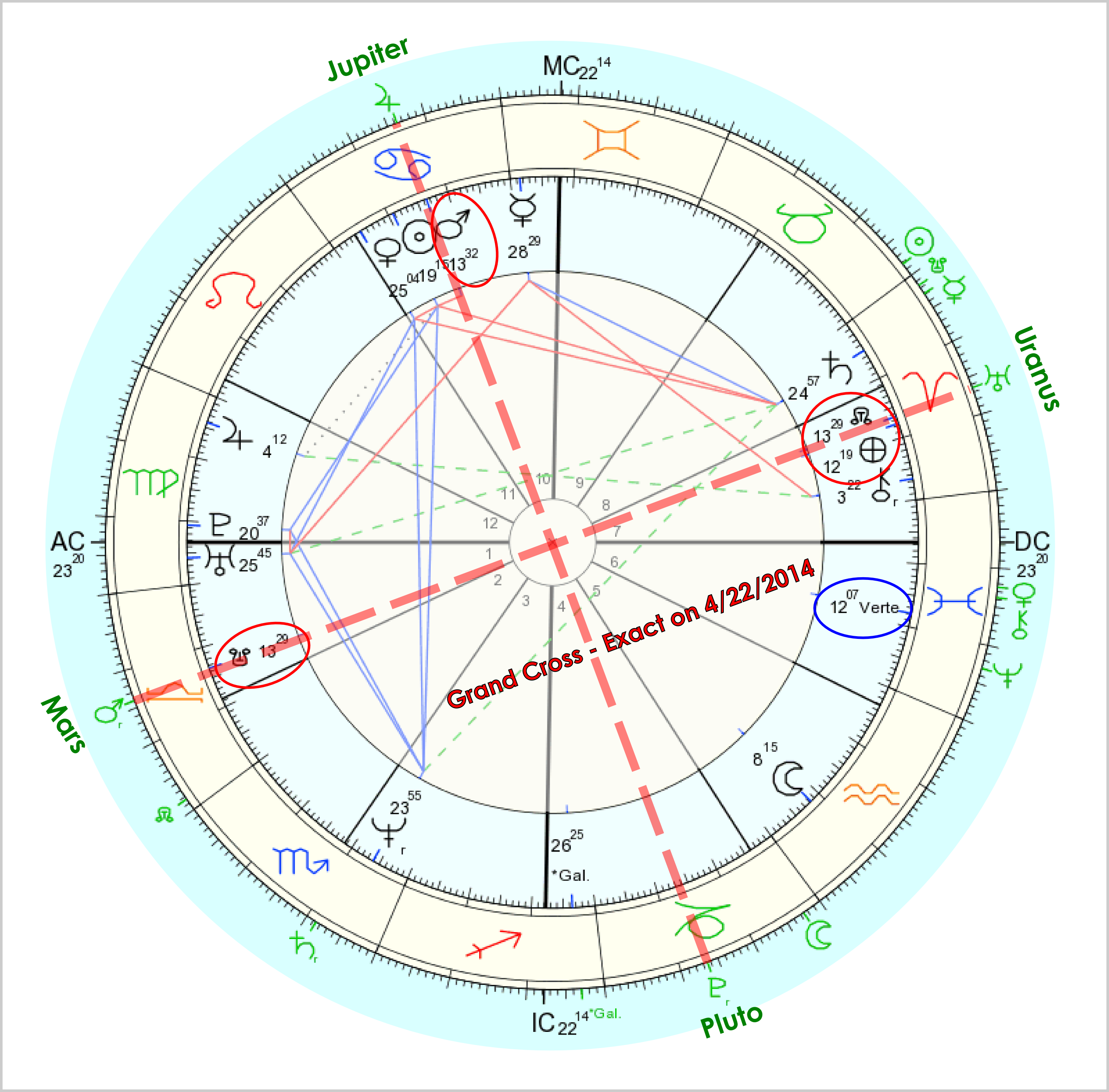 Below is a sample chart I would use in a Transit Reading. It shows the Grand Cross overlaid on a natal chart with aspected planets highlighted. Note that this person has late Virgo on the Ascendant, which aligns the same as one with Libra Rising with regards to the Grand Cross.