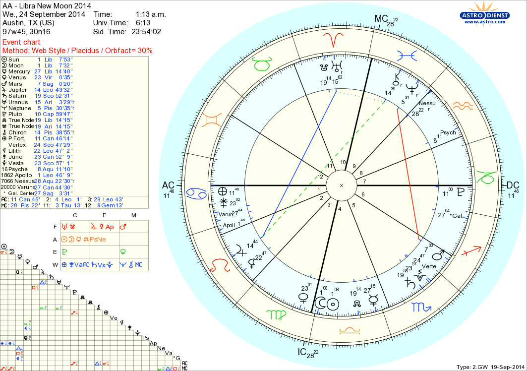 So, in general, Libra, according to me, is about balancing…the constant task of adjusting to what life throws our way. This year, I think Libra will be about rebalancing. And if the Libra new moon chart for Austin has anything to say on the subject, the rebalancing must start at home.