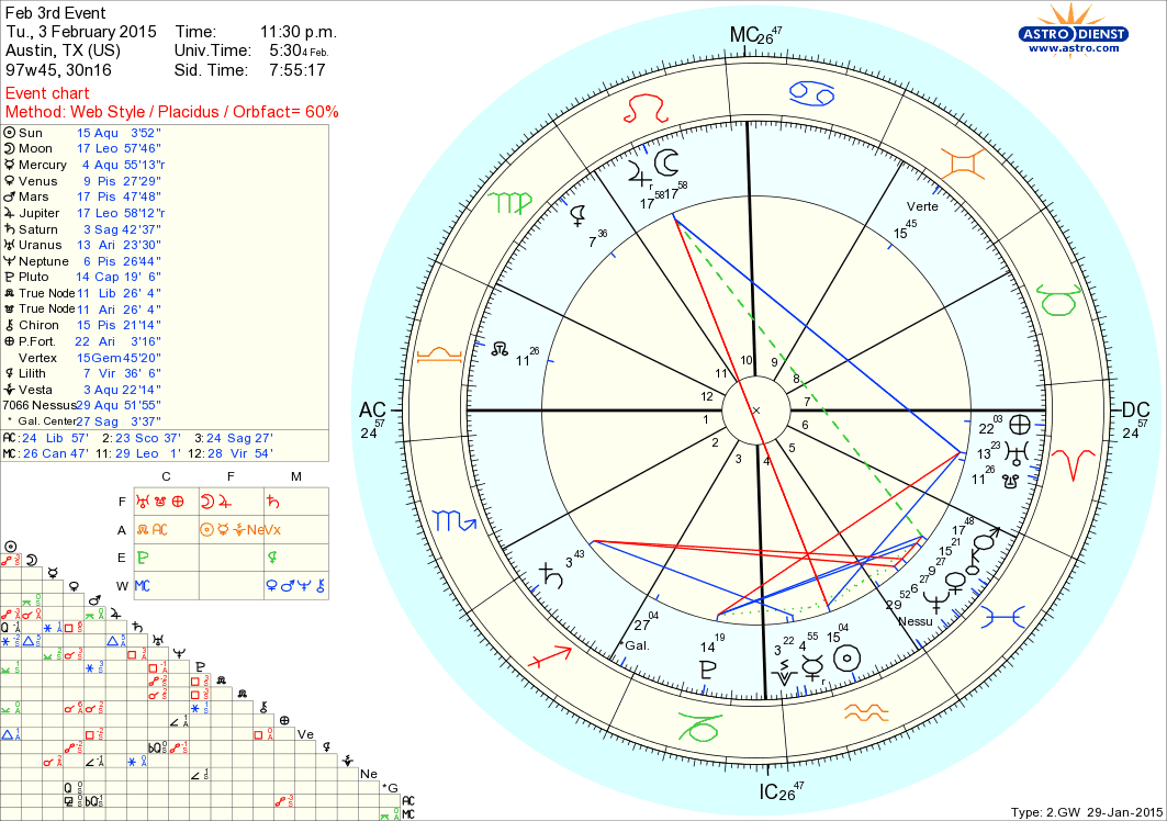 In the Austin chart for this event, Mars, Chiron, and Venus sit in the 5th house, an expressive, creative house associated with Leo—more drama, more show.