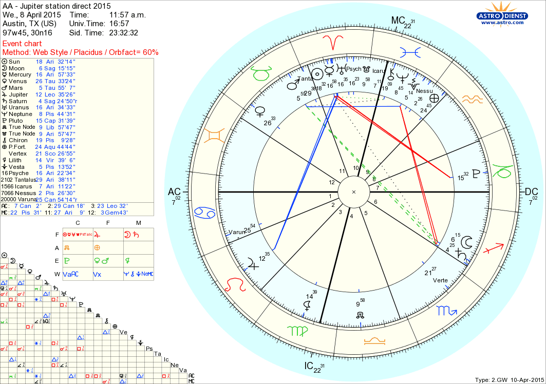 In yesterday’s post, I mentioned that Jupiter stationed direct in Leo on April 8, 2015. Let’s look at that chart more closely: