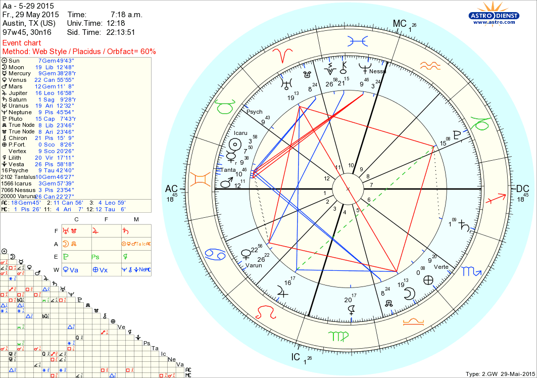 One difference between yesterday and today is in Libra where the moon has moved off of the North Node and entered the opposition with Uranus. The second difference is in Gemini where Mars is further separating from the arrangement, but where the sun now moves into it. Mercury and the sun will conjunct and trade places in about 28 hours (from when I am writing this).