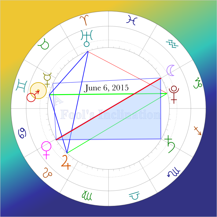 If you look a little closer, you’ll notice that Mercury, retrograde at around five degrees Gemini, rounds out a mystical rectangle. I had mentioned once before that Mercury is helping Saturn ease back into Scorpio by way of a retrograde opposition. Another way of looking at this is Mercury Retrograde is trying to help us figure out what this Saturn Retrograde is all about.