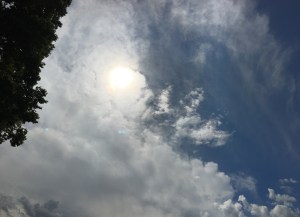 Through the eclipse glasses, the sun was intermittent. When the clouds were thin enough, you could see the moon biting away at the sun with the clouds wafting in front of it. At times, we could see nothing. At 12:30, I was able to capture this: