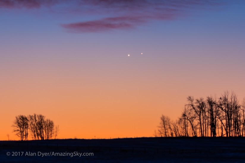 Venus and Jupiter in a very close conjunction (20 arc minutes apart) at dawn on November 13, 2017, from Alberta.