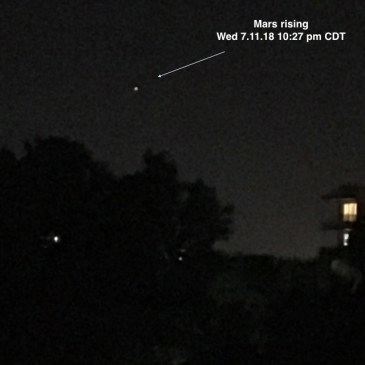 Two nights ago, I went out after 10 pm to see Mars rise. It was conspicuous, easy to find, but not as bright on the hazy horizon as this morning.