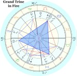 When we combine some of the above, we find: A Grand Trine in the Fire signs consisting of Moon in Sagittarius, Sun in Leo, and Chiron in Aries. A Trine is maximally harmonious. The vibration of each end flows or flips readily to the next. With a Grand Trine, the flow can be so unabated, it can get out of hand.