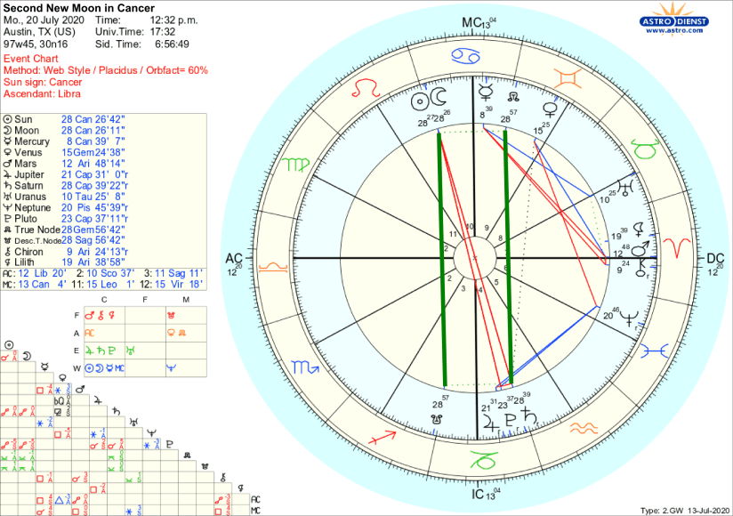 In that earlier post, I mentioned how we have two Cancer New Moons this year. The second one will occur on July 20, 2020. Take a look at this chart.