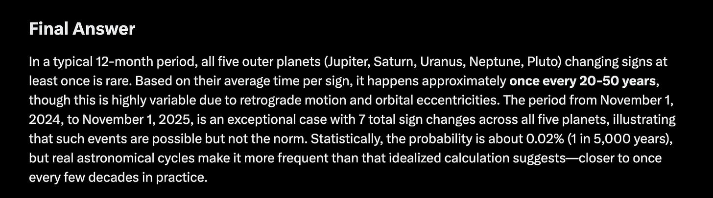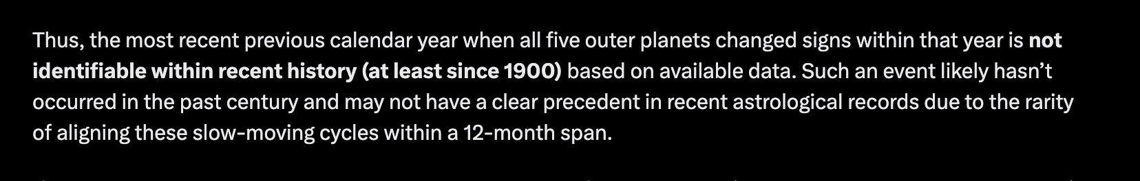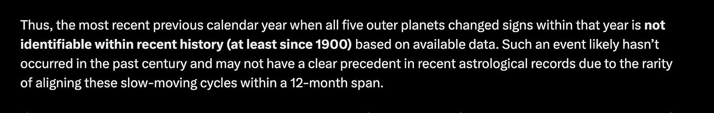 So Grok is saying that, in the past 125 years, it could not find a case where all the outer planets changed signs in the same year. That speaks volumes!