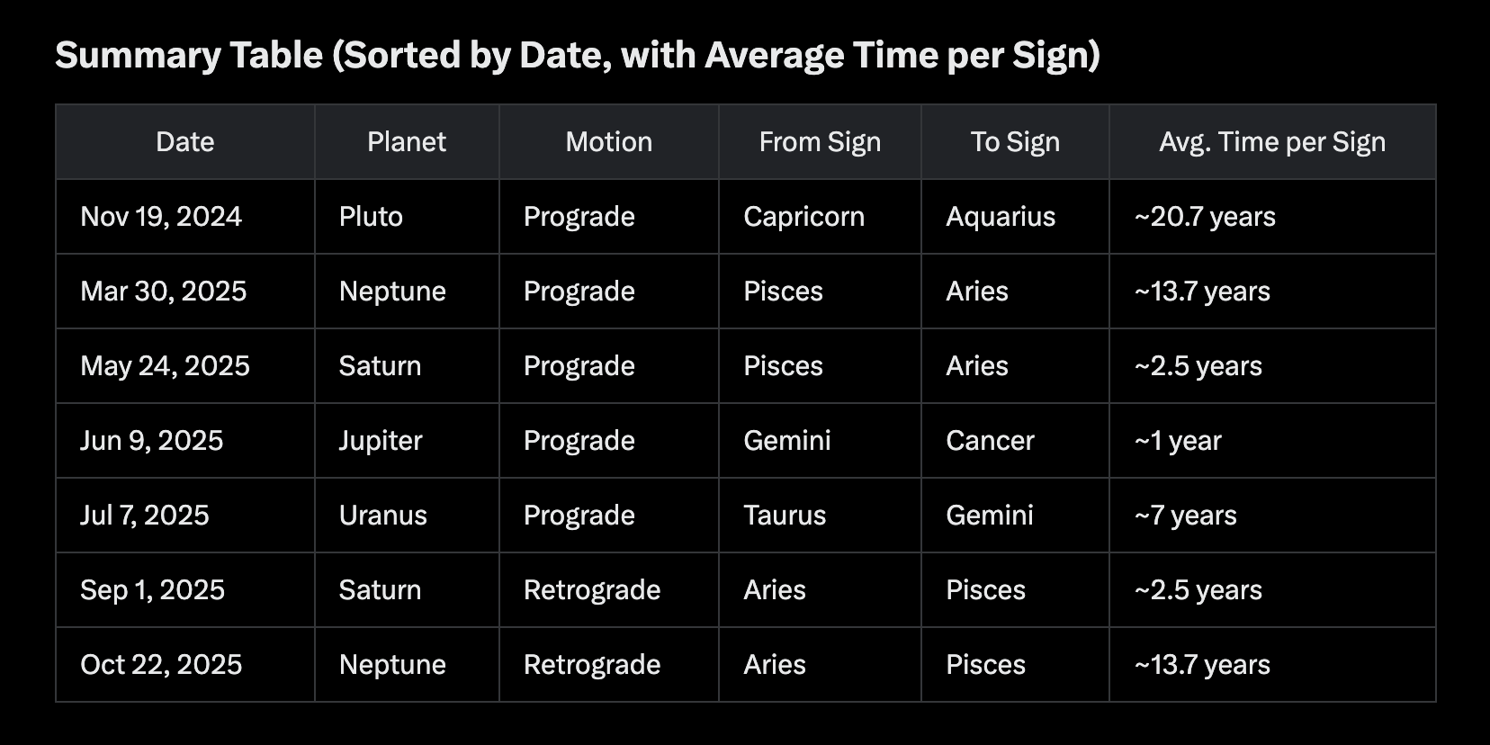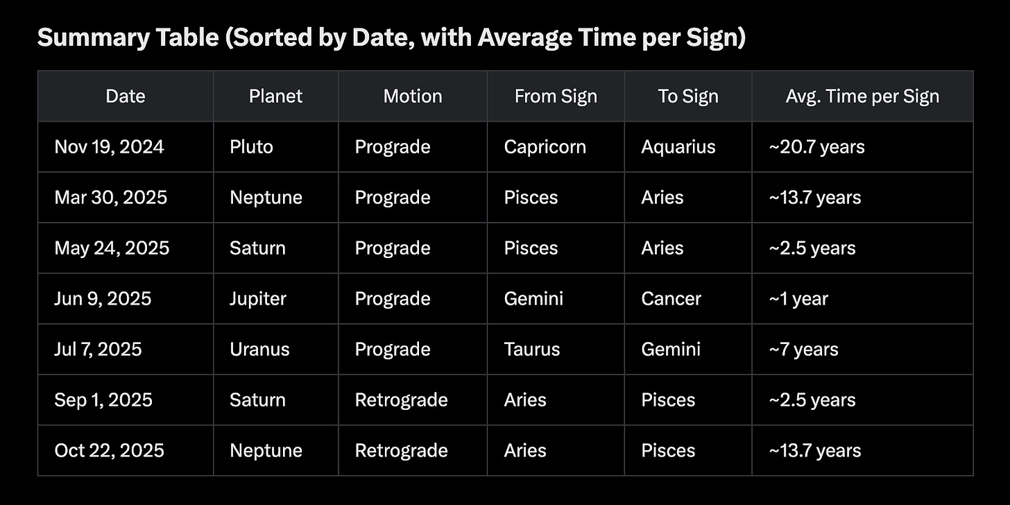I employed Grok to do some grunt work for me. I have been aware, for a while now, that we are within a period of time where all the outer planets are changing signs. I arbitrarily chose the period from November 1st 2024 through November 1st 2025. Here are the outer planet ingresses for this period:
