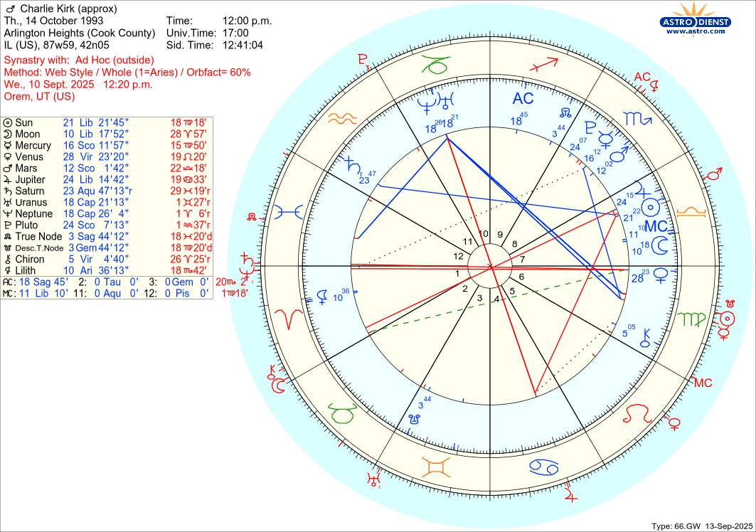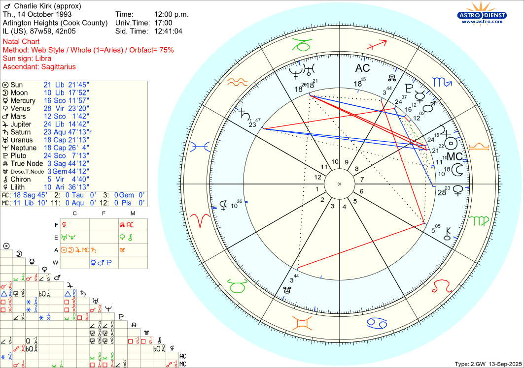 I am looking at Charlie Kirk’s approximate birth chart (first half) and the transits it experienced the moment he was shot (second half). [I cannot find his time of birth, so houses should be ignored when looking at this. Consider only the planets, the signs, and the aspects among them.]