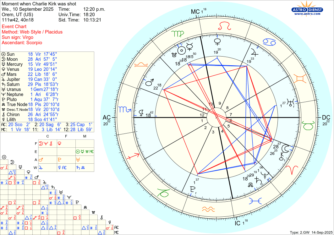 In my previous article, I looked at Charlie Kirk’s birth chart and the transits to it at the moment of the shooting. I now want to focus on the event chart for that moment in time.