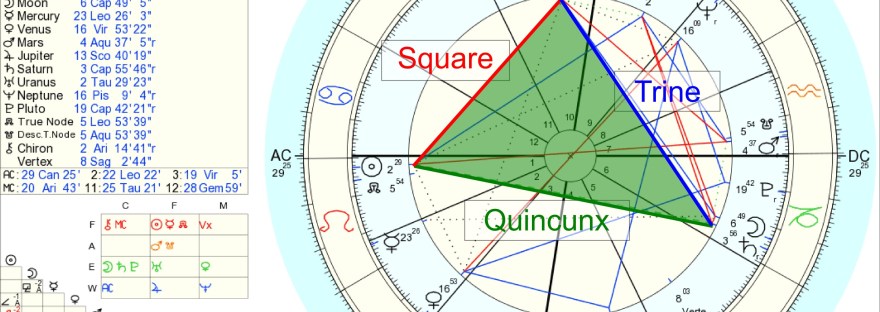 There is one configuration that I didn't discuss yesterday, along with the particular underlying aspect that helps create it. I was aware of the configuration, and familiar with the aspect, but hadn't ever looked into it enough to even learn its name. I have decided to use the chart for the exact moment the sun… Continue reading Quincunx and the Pythagorean Triangle